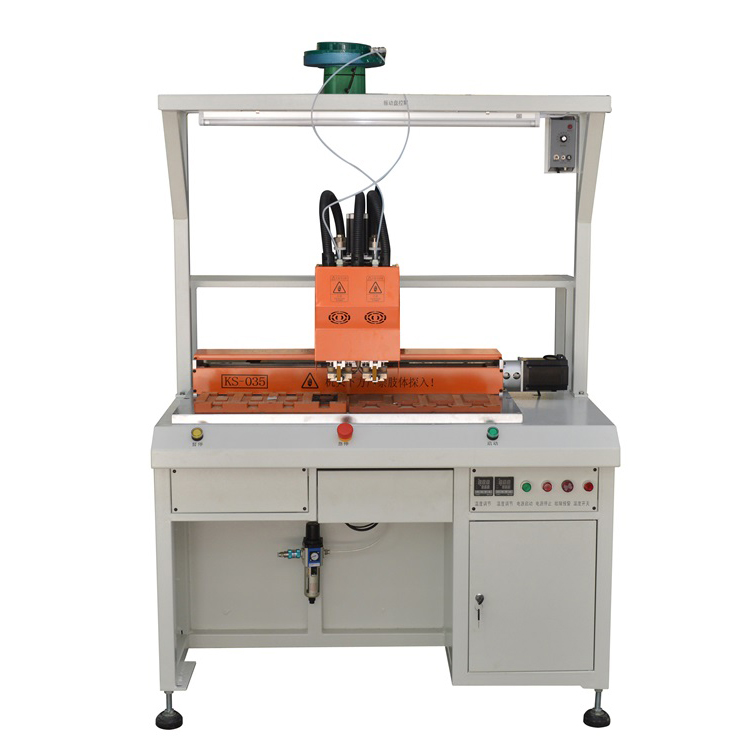 振動(dòng)操作工只需把適應(yīng)加工條件和數(shù)量的銅螺母倒入振動(dòng)盤內(nèi),系統(tǒng)會(huì)自動(dòng)把雜亂無序的螺母變成有序的排列,并自動(dòng)送入柔性管。 送料加熱銅螺母經(jīng)柔性高溫管進(jìn)行排列進(jìn)入銅螺母滑槽內(nèi)部預(yù)熱后送入機(jī)頭內(nèi)部。植入 將已加熱好的銅螺母送至機(jī)殼指定位置,并自動(dòng)按事先設(shè)定好之程序?qū)⒙菽钢踩胨苣z機(jī)殼內(nèi)。 數(shù)控通過編程控制X、Y、Z軸,驅(qū)動(dòng)電機(jī)實(shí)現(xiàn)精準(zhǔn)定位,機(jī)械手再準(zhǔn)確的把銅螺母植入到相應(yīng)的位置上。
